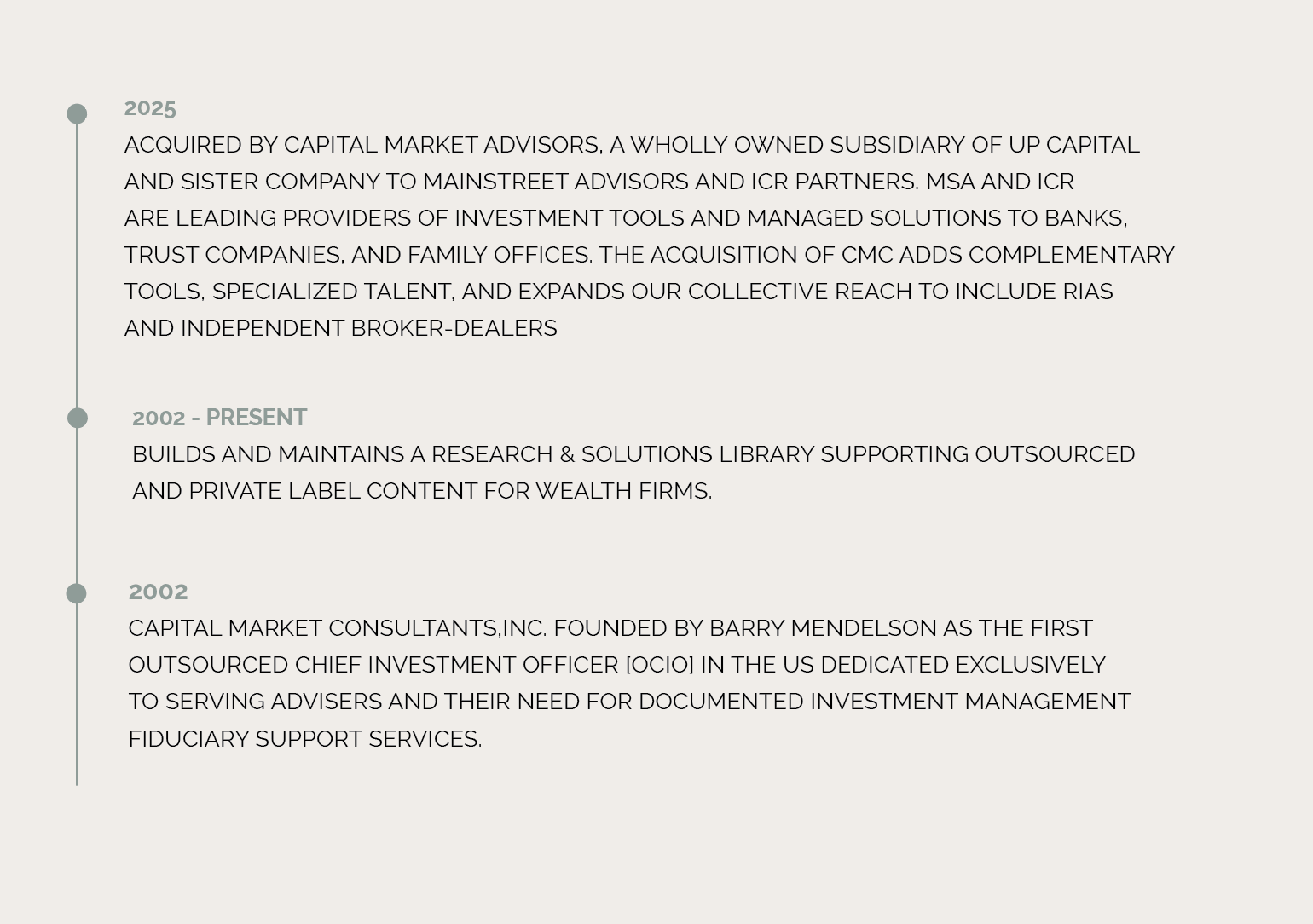 Our journey began with the acquisition of Capital Market Consultants—a firm with a 20+ year history of delivering thoughtful portfolio design and investment research to wealth managers and fiduciary institutions